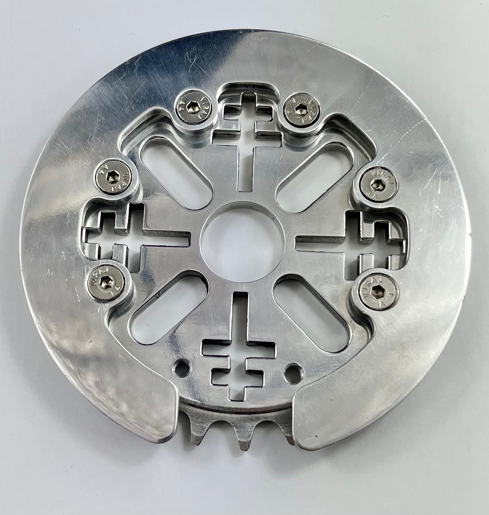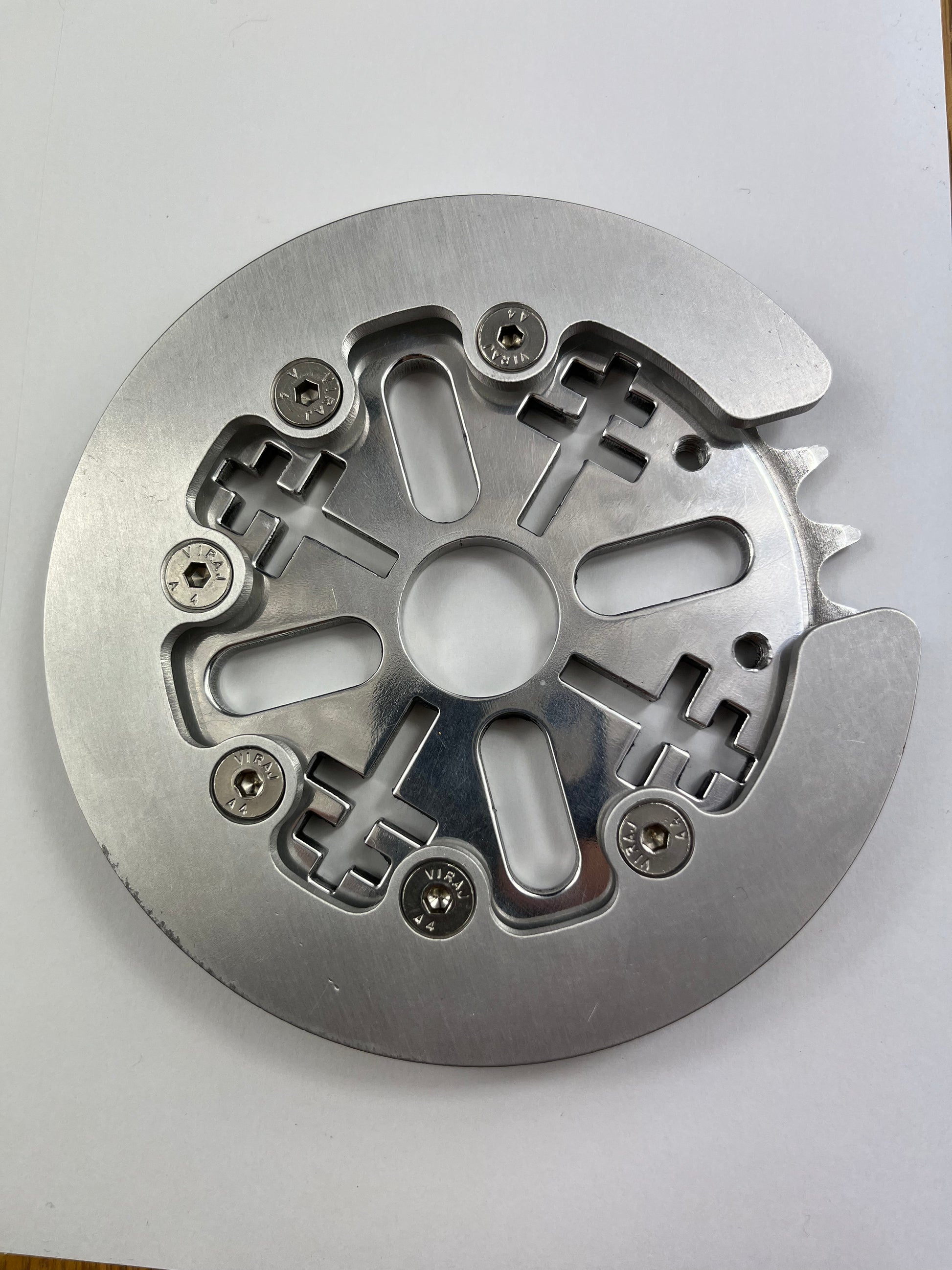 Couronne 27 dents en aluminium 7075 découpé au jet d'eau puis en suite usiné.